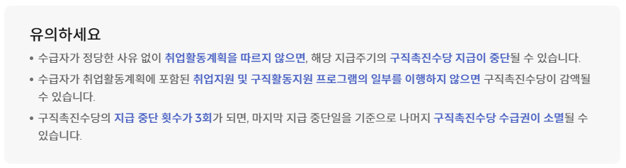 또한, 매월 50만 원 이상의 소득이 있는 경우에는 구직촉진수당은 받을 수 없지만, 취업 상담, 교육 등의 제도는 여전히 이용 가능합니다.