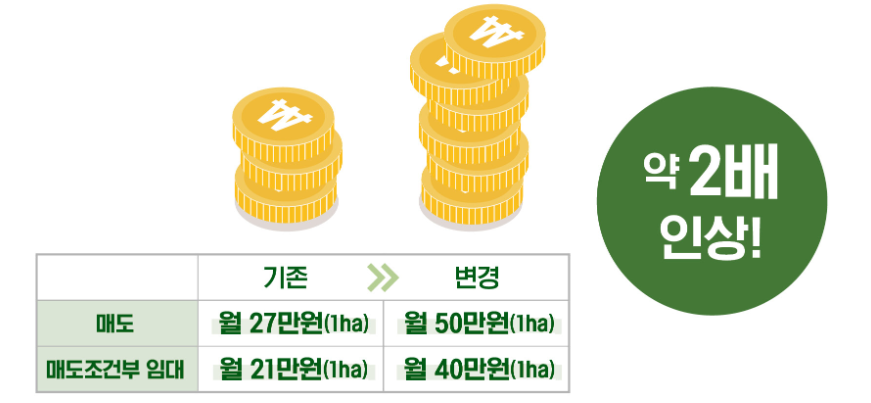 두 번째 방식은 '매도 조건부 임대'로, 이 경우에는 은퇴직불형 농지연금과 농지임대료, 그리고 농지이양은퇴직불금을 포함하여 매월 1헥타르당 40만원(연 480만원)씩 최대 10년간 지급받습니다.
