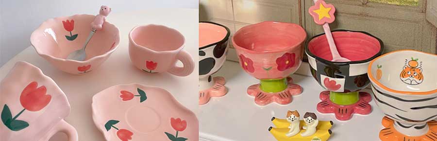 컬러풀한 색상의 파스텔톤으로 머그컵과 플레이트 set 가 있고 진한 색감으로 눈에 확 띄는 귀여운 머그컵이 있다.